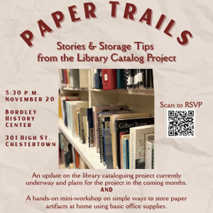 Museums professional Lana Faber will present a talk about the Library Catalog Project currently underway at the Historical Society, including an update on progress, a look at what’s to come in the coming months, and perhaps some tidbits about the treasures she’s discovered during the project so far. She will also offer a mini-workshop on simple ways to store paper artifacts at home using basic office supplies.